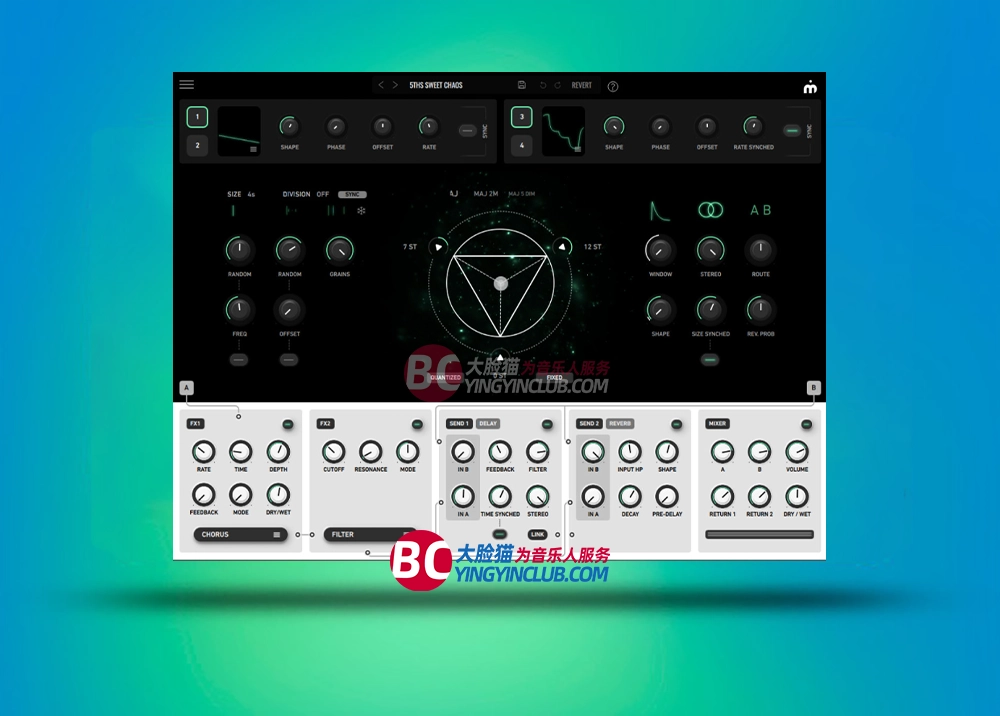 以及基于概率的粒子路由系统,用户可以将粒子分配到两个多重效果引擎、混音器以及独立的延迟和混响通道。