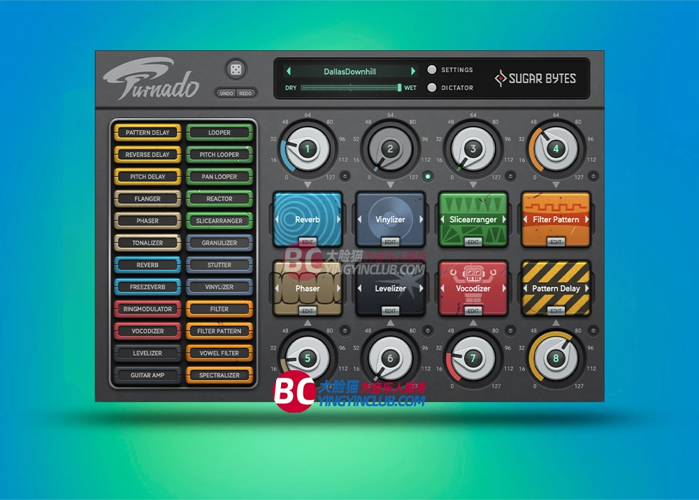 - 8个旋钮控制24种效果:每个旋钮可触发并实时调节一种效果,支持从经典(延迟、混响、滤波、放大器)到前沿(调制、循环、变换、DJ效果)的多样化算法。